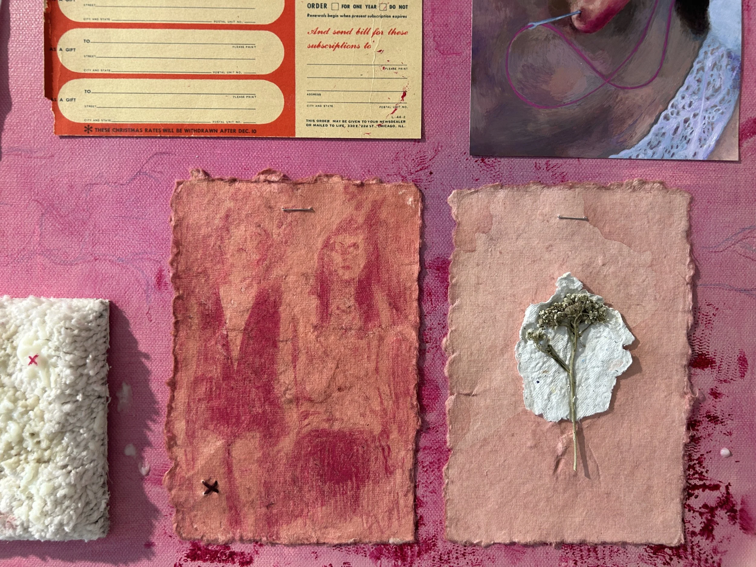 Dimensions variable, oil pastel, pastel paper, aluminum foil, muslin, acrylic paint, canvas, 2024